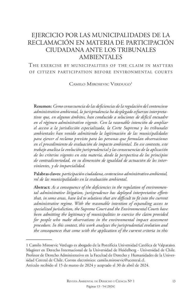 Como consecuencia de las deficiencias de la regulación del contencioso administrativo ambiental, la jurisprudencia ha desplegado esfuerzos interpretativos que, en algunos ámbitos, han conducido a soluciones de difícil encuadre en el régimen administrativo vigente. Con la razonable intención de ampliar el acceso a la jurisdicción especializada, la Corte Suprema y los tribunales ambientales han venido admitiendo la legitimación de las municipalidades para ejercer el reclamo previsto para las personas que formulan observaciones en el procedimiento de evaluación de impacto ambiental.
