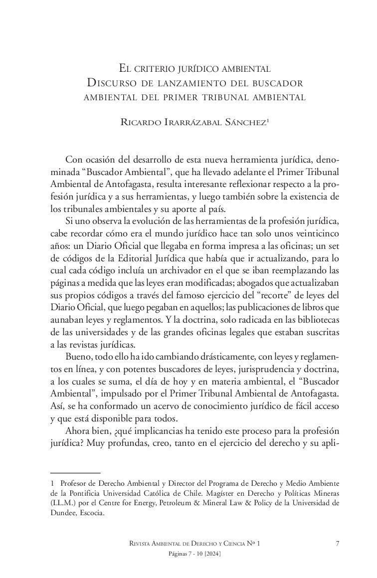 El texto corresponde al discurso del profesor Ricardo Irarrázabal Sánchez pronunciado en el lanzamiento de la biblioteca digital denominada “Buscador Ambiental” del Primer Tribunal Ambiental, en mayo del año 2023.
