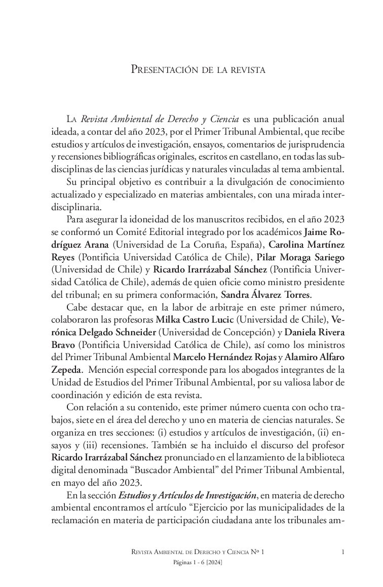 La Presentación de la Revista Ambiental de Derecho y Ciencia expone el propósito, alcance y contenido del primer número de esta publicación anual, creada en 2023 por el Primer Tribunal Ambiental. La revista tiene como objetivo central contribuir a la divulgación de conocimiento ambiental actualizado y especializado, integrando de manera sistemática las ciencias jurídicas y las ciencias naturales desde un enfoque interdisciplinario.